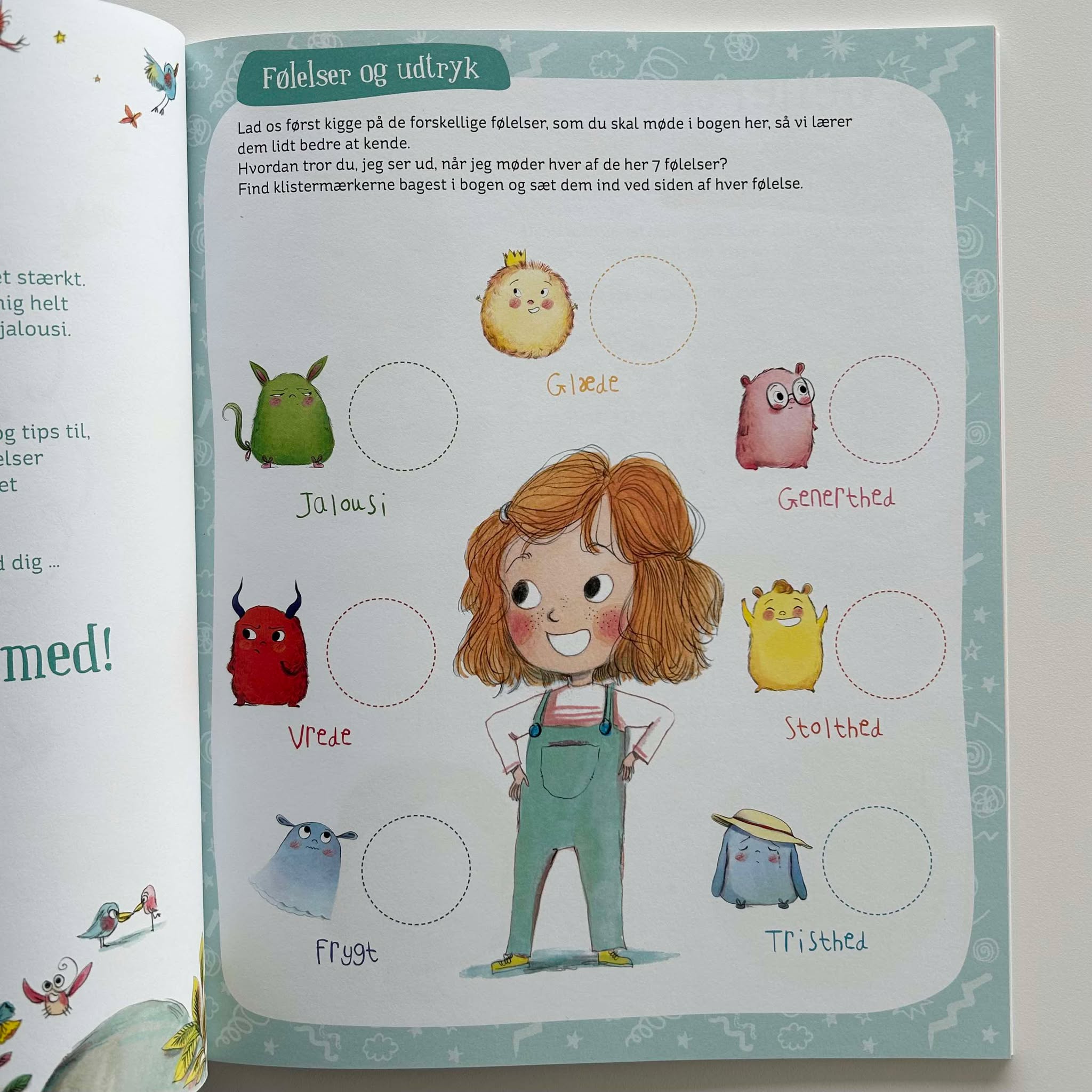 Bogen gør det sjovt og let for barnet at lære om følelser med klistermærker, humørhjul og huskespil med følelser.