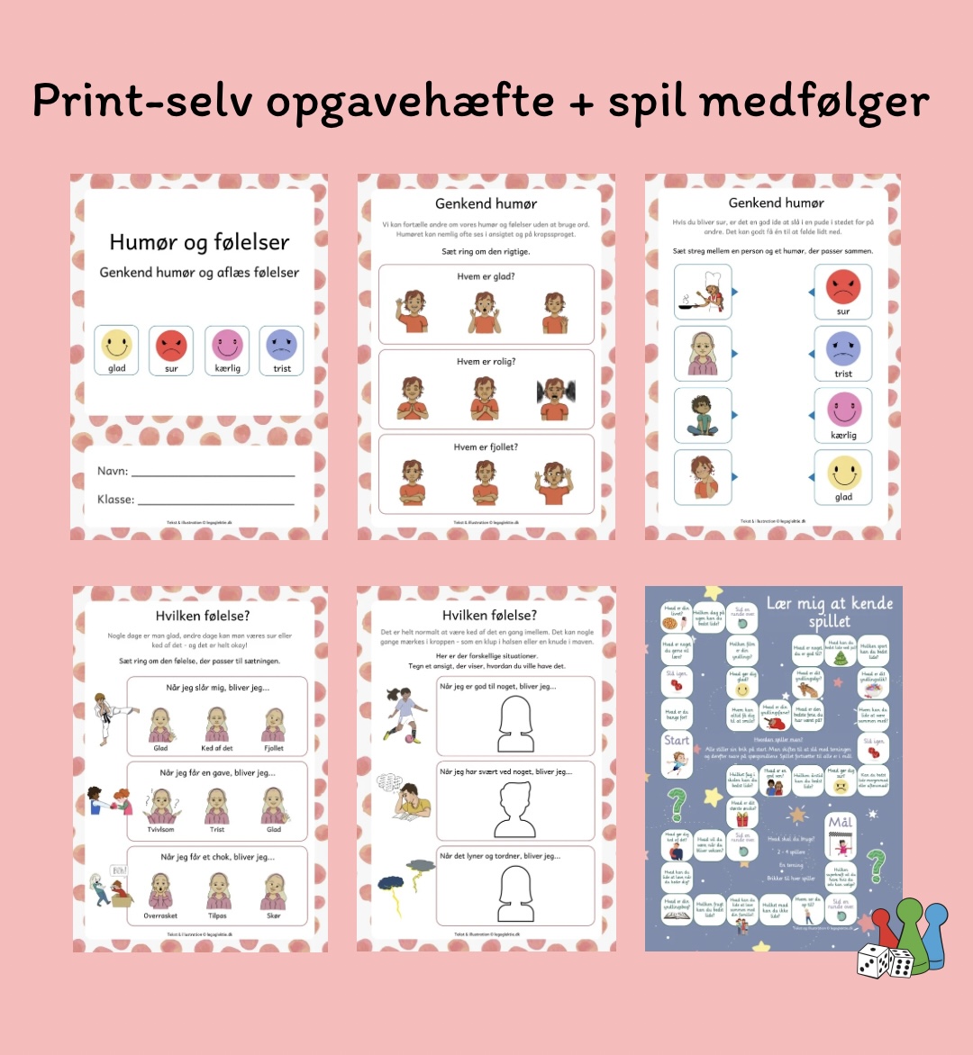 Som en del af varen medfølger to digitale varer til print-selv – opgavehæfte med genkend humør og spil om mig.
