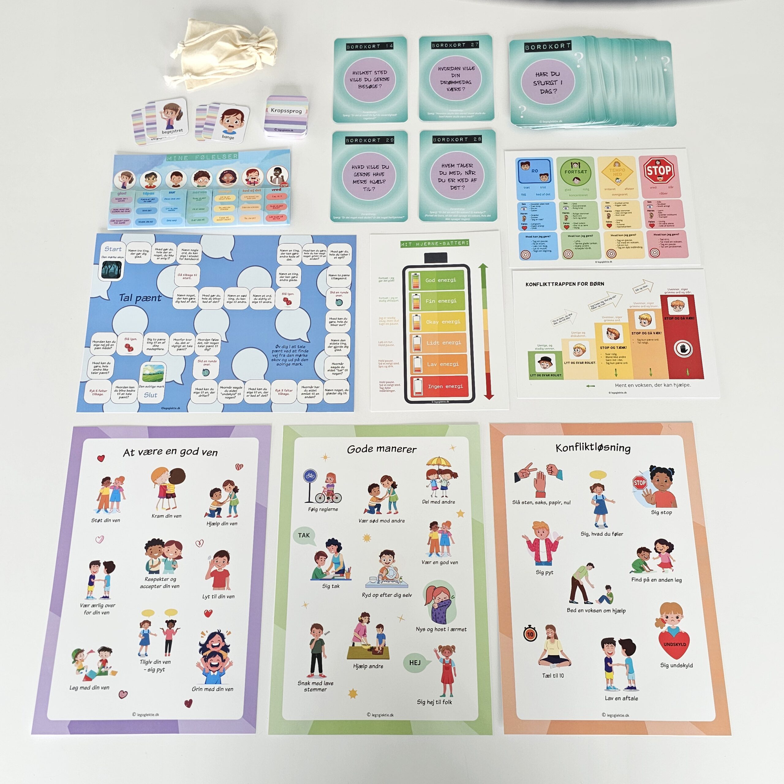 • Pakken med sociale spilleregler (3 x plakater, 1 x spil og 2 x terninger)