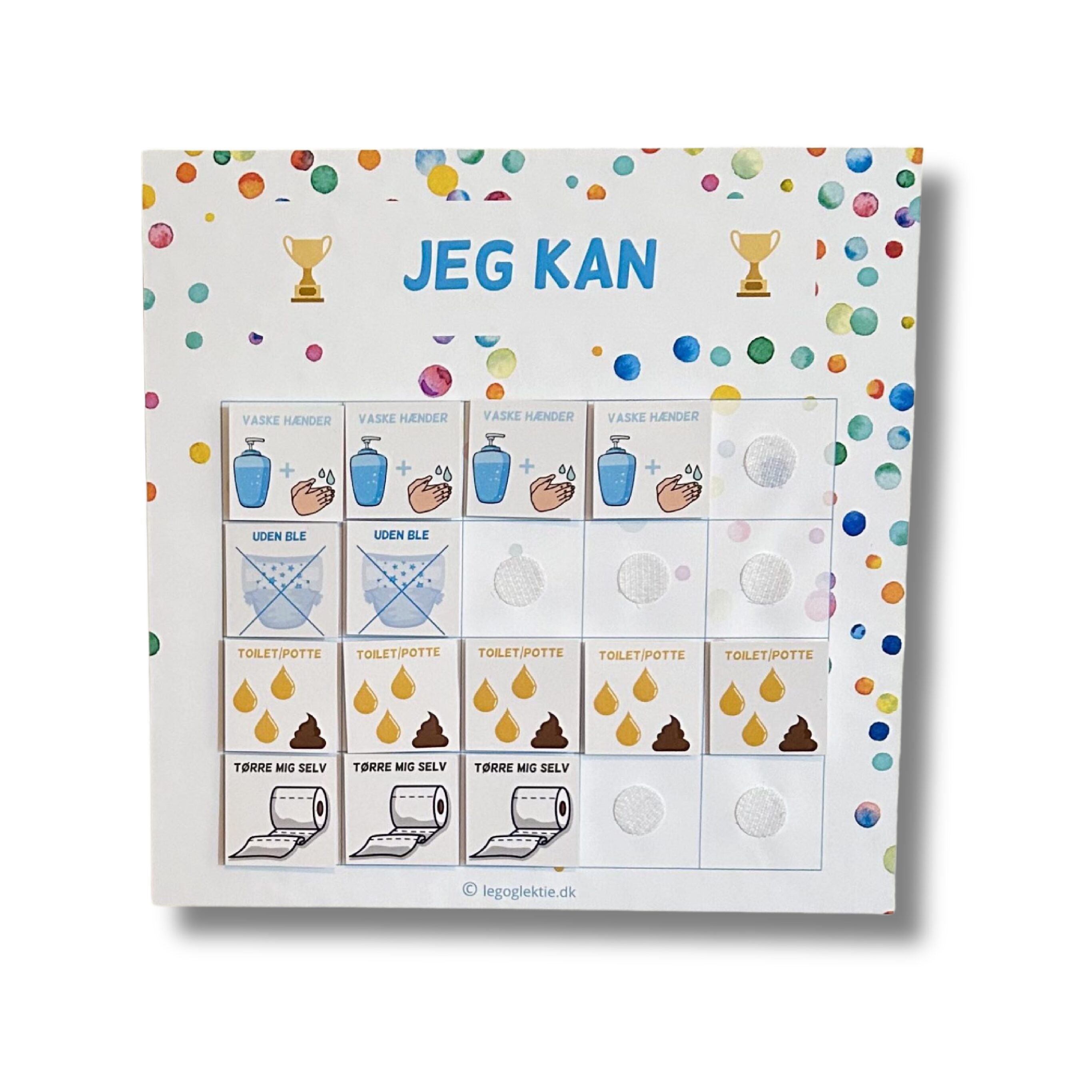 “Jeg kan” tavlen er en motiverende belønningstavle, som skal støtte dit barn i sin udvikling. Du kan bruge “Jeg kan” tavlen til både pottetræning, stoppe med ble eller sut, huske håndvask, børste tænder eller hvis du skal motivere dit barn til at tørre sig selv efter et toiletbesøg. Tavlen her er et genialt redskab til at støtte dit barn i at komme i mål!