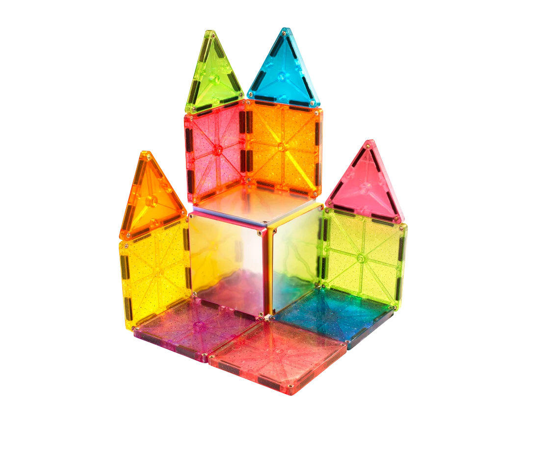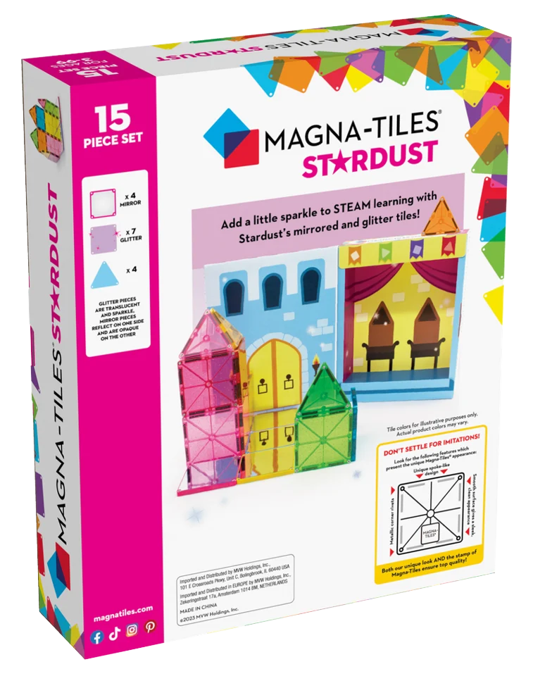 Med MAGNA-TILES® Stardust får dit barn 15 funklende magneter, der glitrer som stjerner på nattehimlen! Nogle af magneterne er fyldt med glimmer, mens andre af dem er små spejle, der fanger lys og farver og sender dem tilbage i rummet. Perfekt til børn, der elsker at bygge – og som gerne vil give deres kreationer et ekstra pift af stjernestøv.