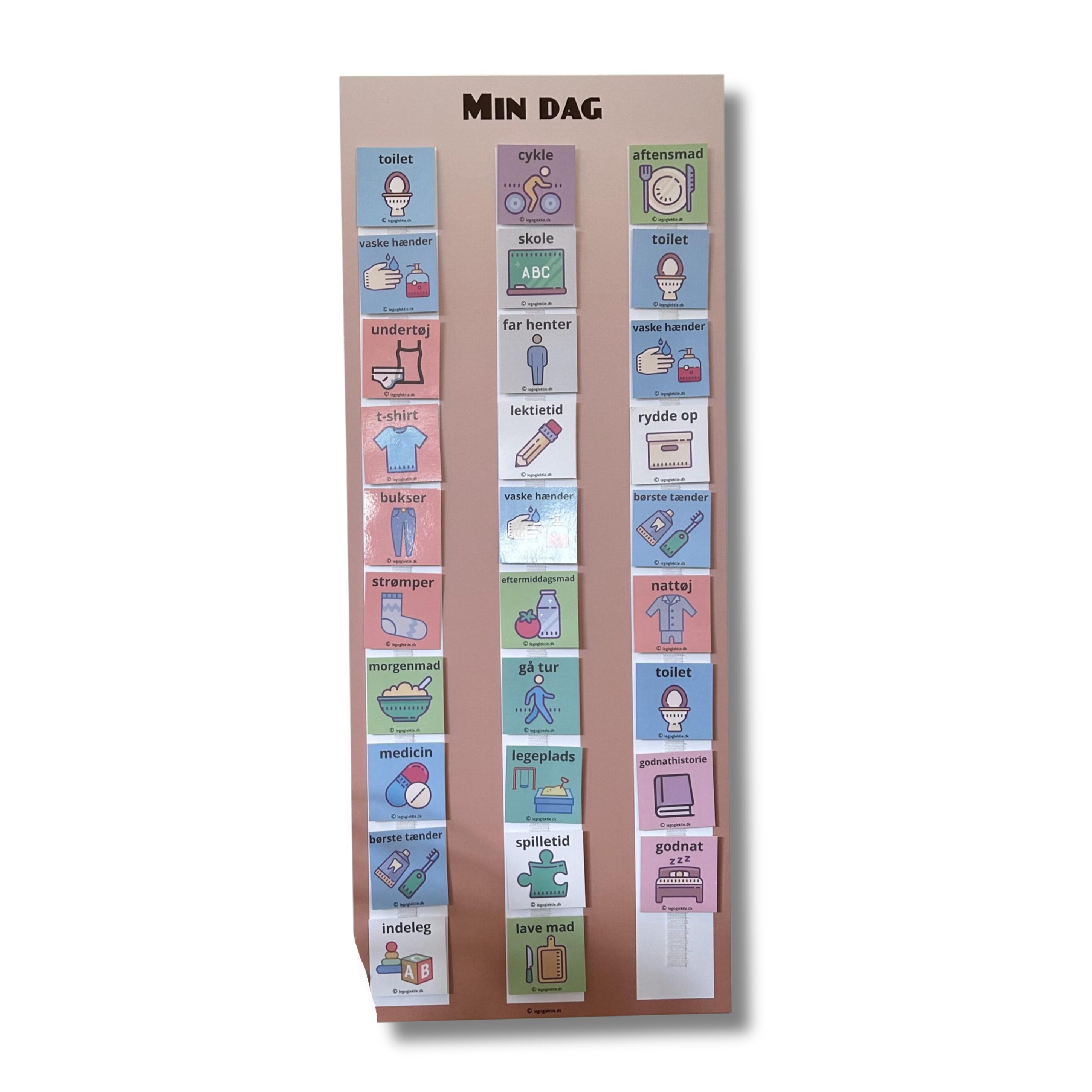 Min dagsplan (ikke hverdagstavlen eller “Min kalender”, der også er på billedet) er et fantastisk værktøj, som giver struktur, synlighed og forudsigelig for dit barn.